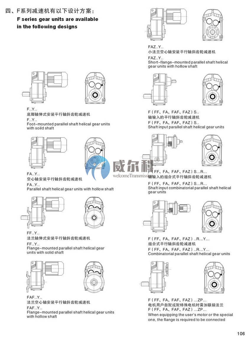 F系列平行軸斜齒輪減速機(jī),結(jié)合國際技術(shù)要求制造 ,具有很高的科技含量,節(jié)省空間,可靠耐用,承受過載能力高,功率可90KW一上,能耗低,性能優(yōu)越,減速機(jī)效高達(dá)95%以上 ,振動小嗓音低,節(jié)能高,選用優(yōu)質(zhì)鍛鋼材料,鋼性鑄鐵箱體,齒輪表面經(jīng)過高頻熱處理,經(jīng)過精密加工, 確保軸平行度和定位的精度,這一切構(gòu)成了齒輪傳動總成的減速機(jī)配置了各種類電極,形成了電極一體化,完全保證了產(chǎn)品使用質(zhì)量特性