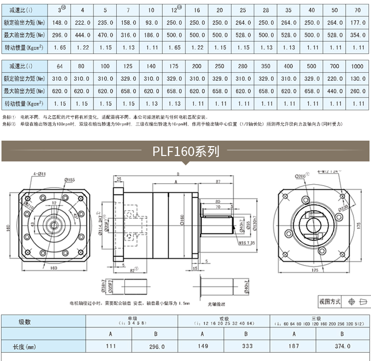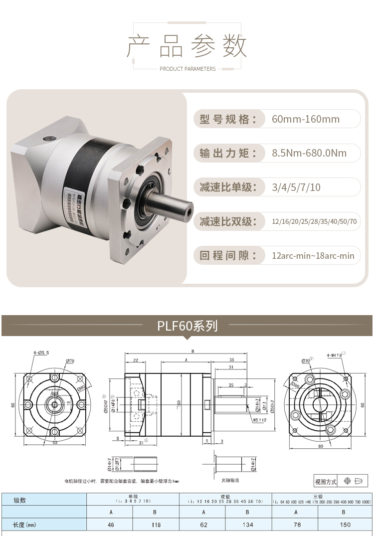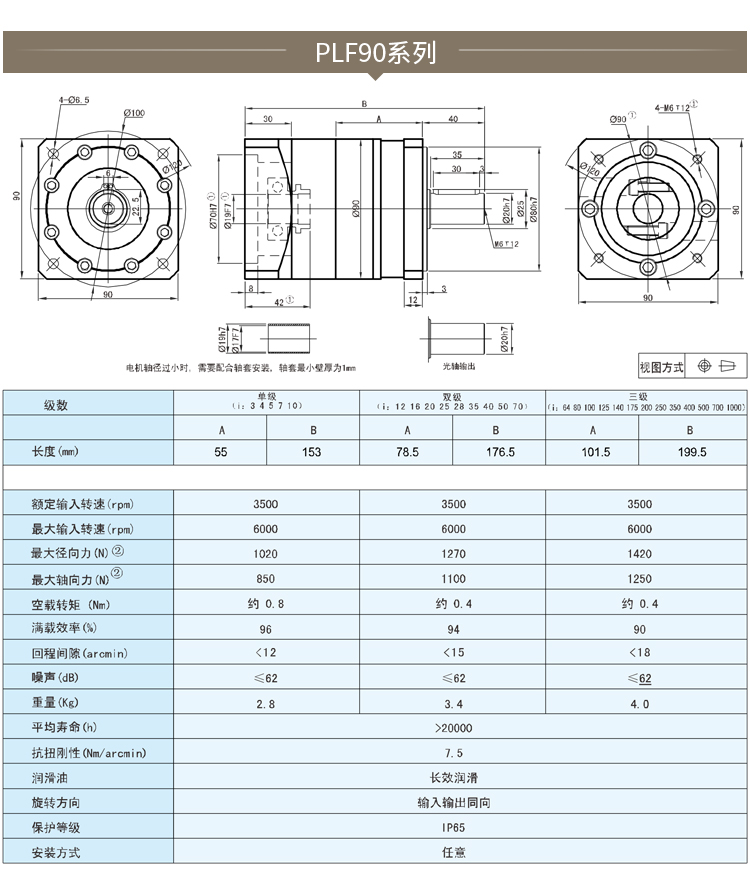 行星減速機特點:產(chǎn)品全面升級,采用前后油封,齒輪配件日本進口,國際知名品牌NSK軸承,具有高精度、高鋼性、高負載、高效率、高速比、高壽命、低慣性、低振動、低噪音、低溫升、外觀美、結構輕小、安裝方便、精確定位等特點,適用于交流伺服馬達、直流伺服馬達、步進馬達、液壓馬達的增速與減速傳動。能與任何電機匹配安裝(如松下,安川,三菱,西門子,富士,臺達,東元,臺安,匯川,信捷,埃斯頓......)電機不同,與之匹配的尺寸將有所變化,適配器將不同,配特殊電機可以訂做??!